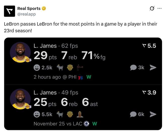 此外,詹姆斯還創下了兩大NBA歷史第1的神跡。第1、數據顯示,詹姆斯(轟下了29分)超越了自己,刷新了球員在職業生涯第23個賽季的單場得分紀錄。