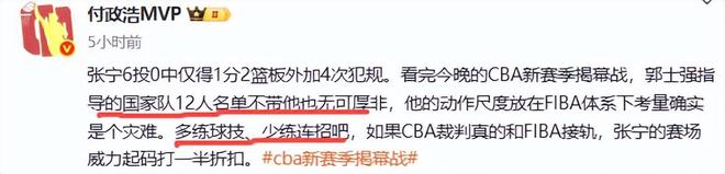 賽后付政浩發(fā)文稱,郭士強指導(dǎo)的國家隊12人名單不帶他也無可厚非,他的動作尺度放在FIBA體系下考量確實是個災(zāi)難。多練球技、少練連招吧,如果CBA裁判真的和FIBA接軌,張寧的賽場威力起碼打一半折扣。山西球迷接受不了這一評價,“僅憑一場比賽就能得出這樣的結(jié)論嗎?有點武斷了吧。”付政浩正色道:這還武斷?看了他四個賽季了,動作一年比一年離譜。其實完全可以去跨界UFC試試。