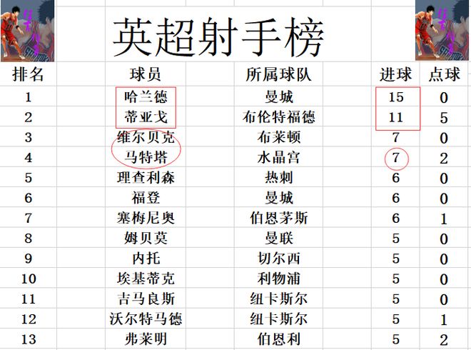 射手榜方面,哈蘭德15球領(lǐng)跑,蒂亞戈11球排名第2,馬特塔今天沒有進(jìn)球,還是和維爾貝克7球并列第3。內(nèi)托,埃基蒂克,姆貝莫等人5球剛好擠入前十。
