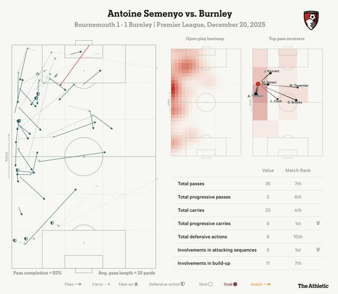 從下面的球員數據面板可以看出,在周六對陣伯恩利的比賽中,塞門約幾乎參與了伯恩茅斯前場的所有進攻組織。